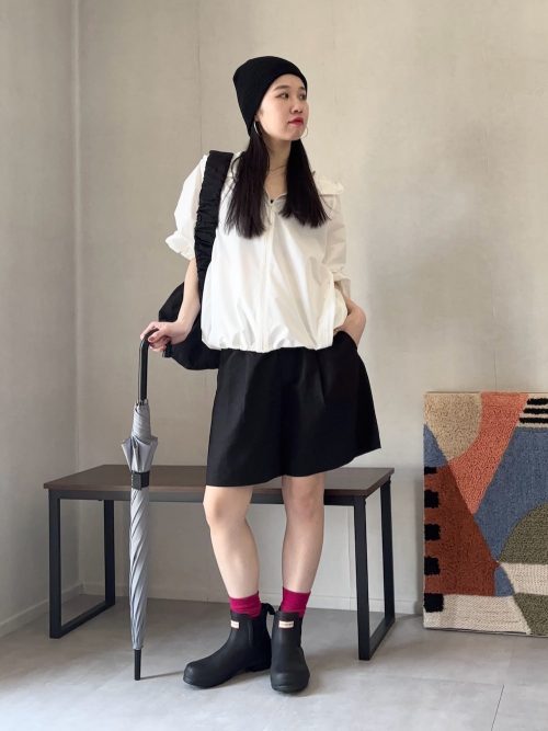 小雨対応のパーカーにショートパンツをあわせた雨の日コーデです。モノトーンをベースにしたスタイリングに足元は防水性の高いハンターのショートレインブーツをあわせて、しっかりと雨対策。差し色の赤ソックスが程よいアクセントになっており、遊び心をプラスしています。雨の日のお出かけが楽しくなるようなスタイルです。