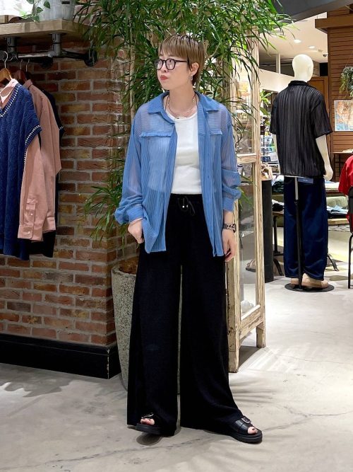 ブルーのシアーシャツが爽やかな印象を与える、リラックス感のあるカジュアルコーデです。軽やかなシアーシャツは、気温差がある日に活躍するアイテム。インナーにはシンプルな白のタンクトップをあわせ、抜け感を演出しています。ボトムスは黒のイージーパンツをチョイス。落ち着いた大人の雰囲気に仕上げた服装です。