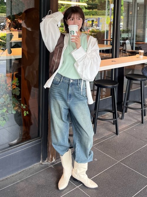 袖のギャザーが目を引く白のシャツが主役のカジュアルスタイルです。インナーには爽やかなミントグリーンのタンクトップを投入し、軽やかな印象に。程よくゆとりのあるストレートデニムとの組み合わせで、リラックスした雰囲気を演出します。