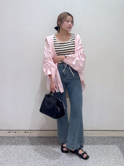 袖のシャーリングが目を引くピンクのシャツを主役にした、春らしいコーデです。インナーは定番のボーダー柄トップスを選択。カジュアルで親しみやすい雰囲気が魅力です。スクエアネックがデコルテをきれいに見せ、顔まわりをすっきりとした印象に仕上げています。
