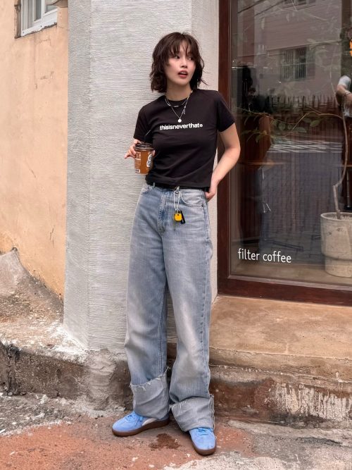 韓国ファッションのトレンドを感じさせる、シンプルながらも印象に残るスタイリング。シルバーネックレスの重ね付けや、ウエストのキーチャームといった小物使いで、個性を加えています。夏のデイリーコーデにぴったりです。