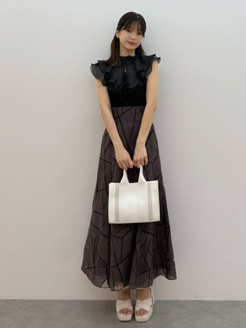 フリルが印象的な黒のブラウスに、幾何学模様が目を引くロングスカートをあわせた服装です。シックな色合いでまとめつつ、トップスのフリルやスカートのシアー素材が軽やかさをプラスしています。スカートは、透け感のある生地に描かれたラインアートがモダンな印象。大人の女性らしい落ち着きと華やかさを両立したスタイリングです。