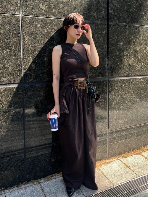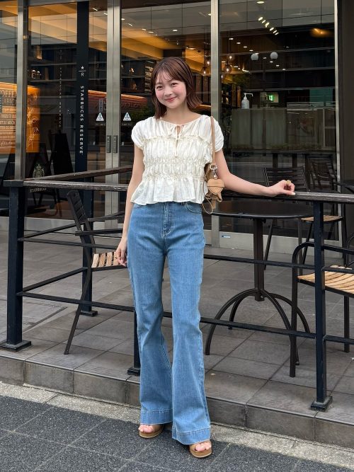 ショート丈のトップスとハイウエストのボトムスは、腰の位置を高く見せる組み合わせ。フレアシルエットが脚のラインをきれいに演出します。雨の日のお出かけにぴったりの、涼しげで軽やかな夏コーデです。