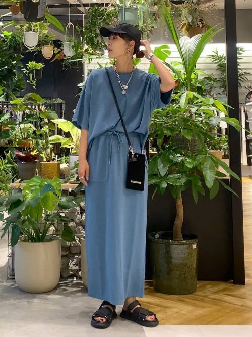 ブルーのTシャツとロングスカートをあわせたセットアップコーデ。リラックス感がありながらも洗練された印象に仕上がっています。ゆったりとしたシルエットのアイテムは、最低気温が24度を超えるような暑い日でも快適に過ごしやすいのが魅力です。