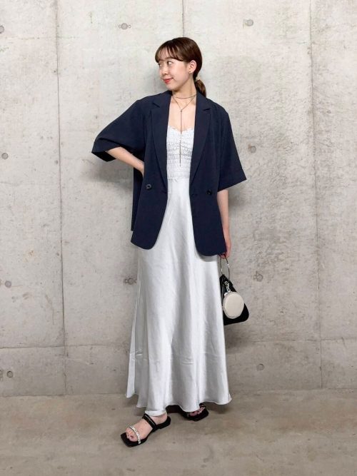 ネイビーの半袖ジャケットを羽織ったきれいめコーデ。女性らしさを引き立てる光沢感のあるスカート、シャーリング付きのキャミソールにマニッシュなダブルジャケットをあわせています。清涼感を演出しつつ、甘さを抑えた大人なバランスに仕上げたスタイリングです。