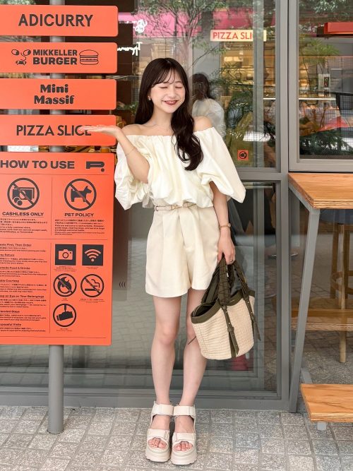 オフホワイトで統一した夏にぴったりの服装です。主役は、ボリュームのある袖が印象的なオフショルダーブラウス。デコルテをきれいに見せるデザインが女性らしさとヘルシーな魅力を引き立てます。同系色のショートパンツとの組み合わせで、統一感のある着こなしに仕上がっているのがポイントです。
