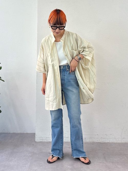ベージュのストライプシャツが主役の、リラックス感あふれるカジュアルコーデです。ゆったりとしたオーバーサイズのシャツは軽やかで涼しげな印象。インナーに白のタンクトップをあわせ、クリーンな雰囲気を加えています。じめっとした雨の日も爽やかに過ごしやすい組み合わせです。
