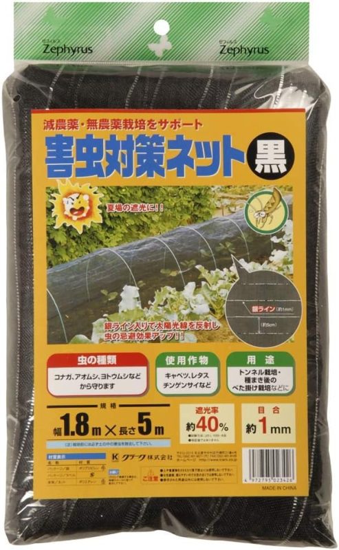 キャベツ・レタス・チンゲンサイなどの栽培におすすめの黒色の防虫ネット。遮光率は約40%で、夏場の遮光用としても使用可能です。目合いは約1mmで、コナガ・アオムシ・ヨトウムシといった害虫の侵入を防ぎます。