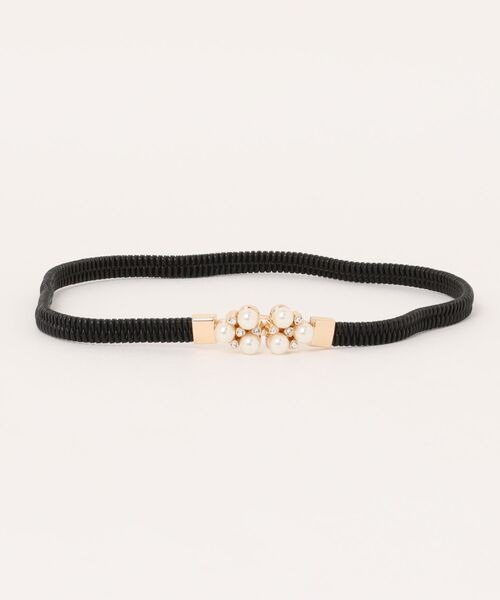 パールとビジューを散りばめたゴールドバックルが華やかなアクセントのレディースベルトです。フェイクレザーを使用しながらも、ストレッチ性の高い素材でウエストにぴったりフィット。バックルは引っかけるだけの簡単着脱で、忙しい朝にも便利な仕様になっています。