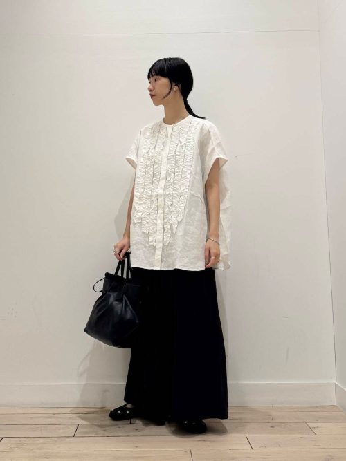 白のフリルブラウスに黒のロングスカートをあわせた、上品なモノトーンコーデです。ブラウスは胸元に立体的なフリルがあしらわれており、顔周りを華やかに演出。ゆったりとしたシルエットと、少し透け感のある素材が涼しげな印象を与えます。