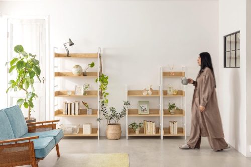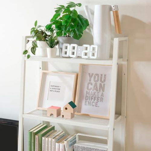 背の高いラックを置く場合は、壁の色に近い明るいカラーを選ぶと圧迫感を抑えられます。また、収納物をおしゃれに見せたいなら、色や素材のトーンを揃えるのが効果的です。単調さを防ぎたいときは、植物のグリーンなどアクセントになる色を少し取り入れて、変化をつけてみるのもおすすめです。