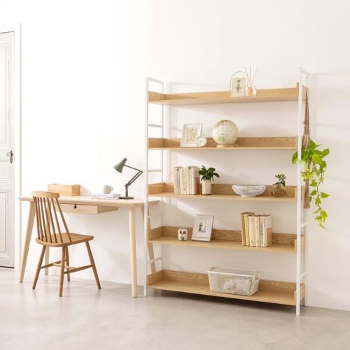 棚板の高さを自在に変えられるオープンシェルフ。アイアンと木材を組み合わせたデザインで、ナチュラル・ホワイトといったカラーを展開し、インテリアに合わせて選べます。高さ約162cmのスリムなボディに、3枚の可動棚を備えているのが特徴です。