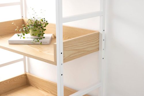 階段のような形状のオープンラック。素材には無垢の天然木を使用しており、木ならではのあたたかみを感じられます。カラーバリエーションは、ホワイト・ナチュラル・ブラウンの3色です。