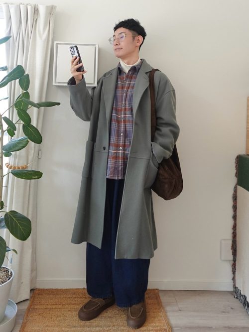 ロングコートにチェック柄のネルシャツを合わせたコーデです。インナーに白のタートルネックを重ね、首元に上品なアクセントを演出。ボトムスはワイドデニムパンツを選び、ゆったりとしたシルエットを作っています。