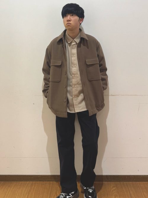 明るいベージュのネルシャツに、ブラウンのキルトジャケットを重ねた秋冬コーデです。アウターは肩の落ちたオーバーサイズを選び、ゆったりとした雰囲気を与えます。同系色でグラデーションを作っているため、落ち着いた印象です。