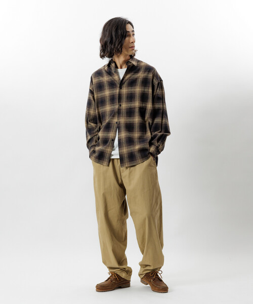 使いやすいカラーリングで仕上げたネルシャツ。生地に起毛加工を施すことで、やわらかな肌触りと奥行きのある表情を両立しています。身幅にゆとりを持たせ、着丈をやや短く設定することで、トレンド感のあるシルエットを実現しています。