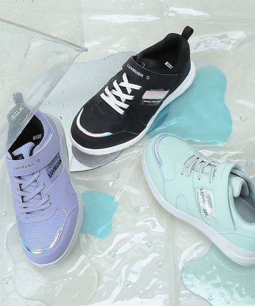 機能性とデザイン性を兼ね備えたキッズスニーカーです。サイドのロゴと透明素材の下から見えるテープがかわいいアクセント。4cm4時間の防水機能を備え、雨の日も足元を快適に保ちやすいのが魅力です。