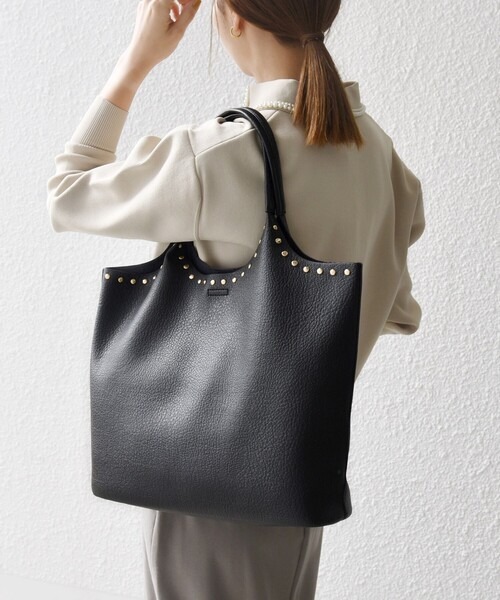 さりげないスタッズ使いがエッジを添えるトートバッグ。A4サイズがゆとりを持って収まる収納力を備え、通勤からお出かけまで軽やかにこなせます。フェイクレザーを採用し、雨の日も気兼ねなく使える手入れのしやすさが魅力です。