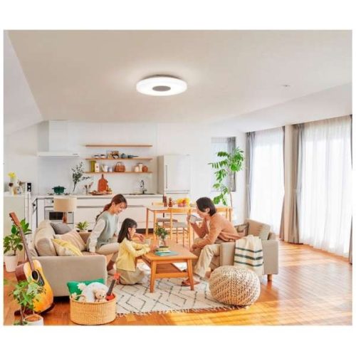 天井まで光が広がる設計で、14畳の空間をしっかりと照らすLEDシーリングライト。演色性Ra85により、肌や食べ物の色を美しく自然に見せられます。