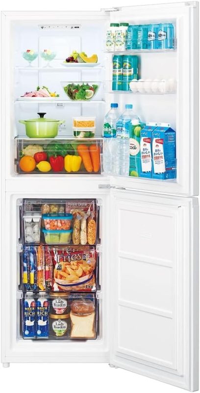 一人暮らしにおすすめの安い2ドア冷蔵庫。容量153Lのコンパクトなサイズながら、2Lペットボトルが3本入るドアポケットや3段のガラス棚を備え、すっきりと収納できます。幅479mmで限られたスペースにも設置しやすいのが魅力です。