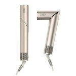 細長いシルエットが特徴的なコンパクトドライヤー。先端を倒すようにして使うとドライヤーとして、アタッチメントを付け替えるとエアカーラーやロールブラシとして、マルチに活躍するモデルです。