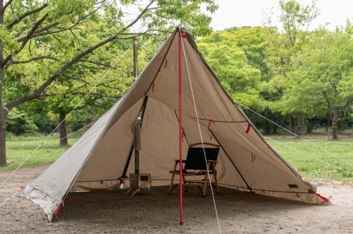二又ポール採用で中央のスペースを有効活用できるティピー型テント。TC素材により焚き火の近くでも安心して使用できます。サイドフラップ標準装備で、別売りポールを使えば広い前室やタープアレンジも可能です。