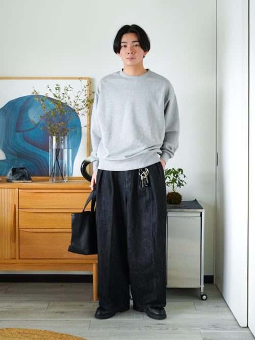 グレーのスウェットに、ボリュームのあるワイドデニムパンツを合わせたきれいめカジュアルコーデです。シンプルなトップスに対し、ボトムスは存在感のある極太シルエットのモノをセレクト。王道の組み合わせを、シルエットで現代的に見せています。