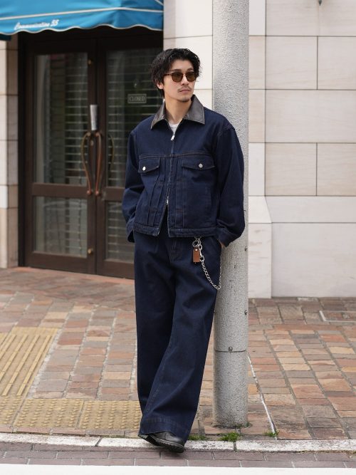 濃いインディゴブルーのデニムジャケットとワイドパンツを合わせた、セットアップ風のコーディネートです。ジャケットはジップアップ仕様で、レザーの襟がアクセント。インナーに白Tシャツをのぞかせ、クリーンな印象もプラスしています。