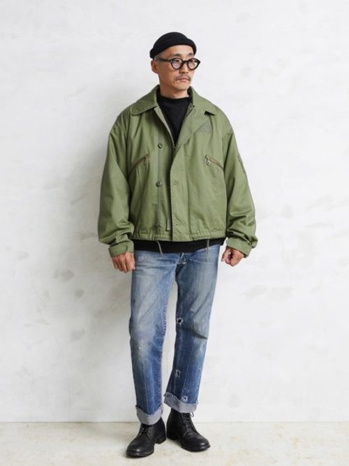 色落ちしたデニムパンツに、ミリタリージャケットを合わせたアメカジコーデです。オリーブグリーンのジャケットはゆったりとしたシルエット。ボトムスはダメージ加工が施されたデニムで、ヴィンテージライクな雰囲気をまとっています。