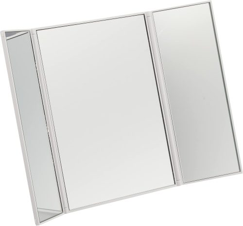三面鏡とは、3枚の鏡がセットになった、折りたたみ式のアイテムのこと。三面鏡を使う一番のメリットは、さまざまな方向から映せることにより、身だしなみを整えやすい点です。