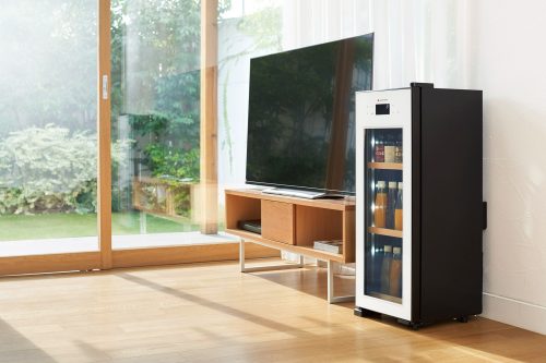 0~22℃まで1℃刻みで温度設定が可能で、ワインやビール、炭酸水はもちろん、日本酒の低温管理にも対応。業務用基準で開発された冷却力により、通常の冷蔵庫の半分の時間で常温の飲み物を5℃まで冷やせます。ワイン9本または一升瓶2本と4合瓶6本が収納可能です。