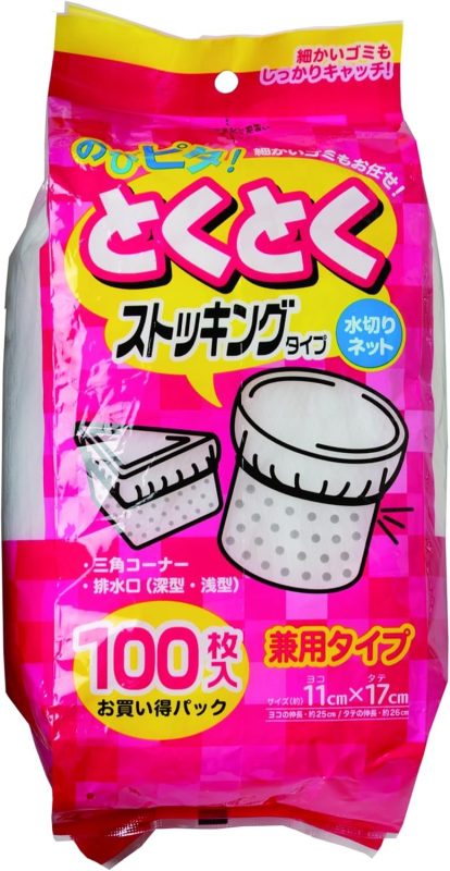 伸縮性に優れたストッキングタイプの水切り袋。排水口や三角コーナーの形状にぴったりフィットするのが特徴です。網目が細かく、小さなゴミやくずなどもキャッチできるのが魅力です。