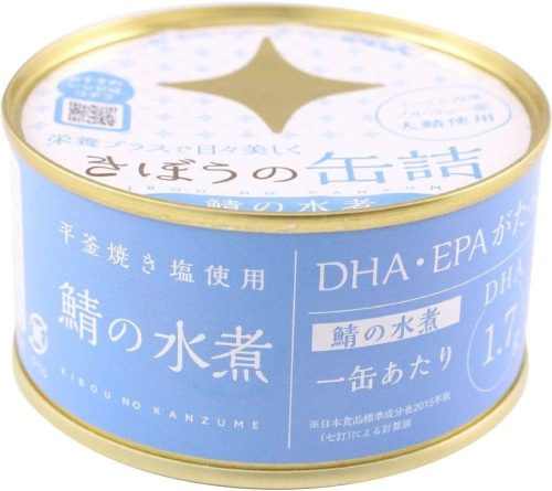 日本で水揚げされたサバを味噌・砂糖で甘辛く煮付けた缶詰です。しっかりとした味付けで、ごはんのおかずにぴったり。100gあたりDHAが890mg、EPAが470mg含まれており、健康に気を遣う方にもおすすめです。