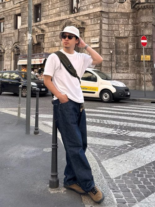 メンズバケットハットの被り方は、浅めと深めの2パターンが代表的です。後ろに傾けて浅めに被ると、顔まわりが明るくアクティブな印象を与えます。角ばった輪郭でもバランスを取りやすく、カジュアルな服装に抜け感をプラスできるのが魅力です。