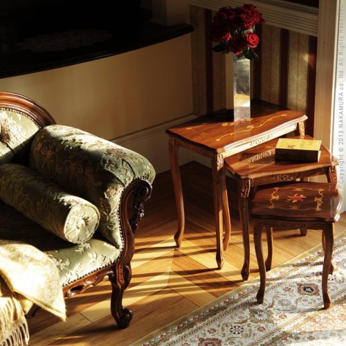 クラシカルな雰囲気のインテリアなら、エレガントなアンティーク調のネストテーブルがおすすめです。繊細で優美な装飾が施された、重厚で高級感のあるデザインが特徴。緩やかにカーブした猫脚を採用したモノが多く、置くだけで華やかな印象を与えます。