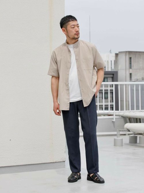 ベージュのバンドカラーシャツを羽織った、大人のリラックスコーデです。インナーにはシンプルな白Tシャツをあわせ、顔まわりを明るく演出。首元のすっきりとした襟元で、涼しげな印象を与えます。