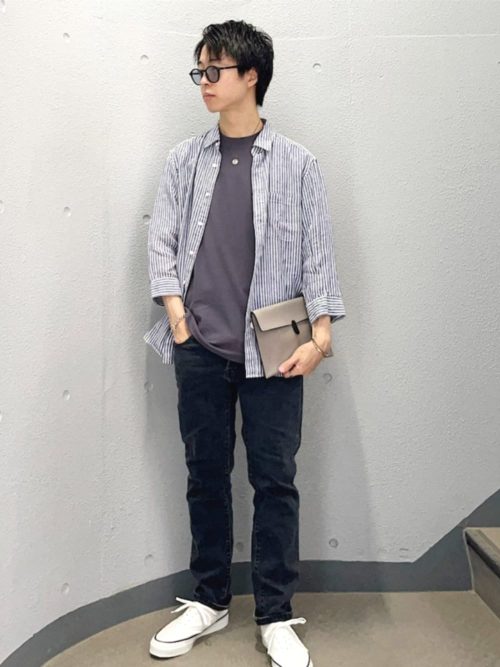 爽やかなストライプシャツを主役にした、清潔感のあるきれいめカジュアルコーデです。インナーには落ち着いた色味のTシャツをあわせ、スリムな濃紺デニムパンツで全体をすっきりと引き締めています。