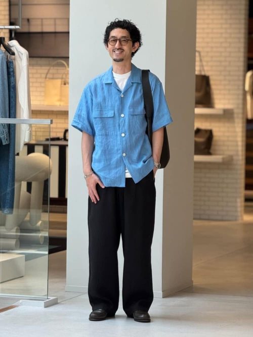 鮮やかなブルーのリネンシャツを主役にした、涼しげなコーディネートです。インナーの白Tシャツで爽やかさをプラス。ボトムスは黒のワイドパンツを選び、リラックスしたシルエットに仕上げています。