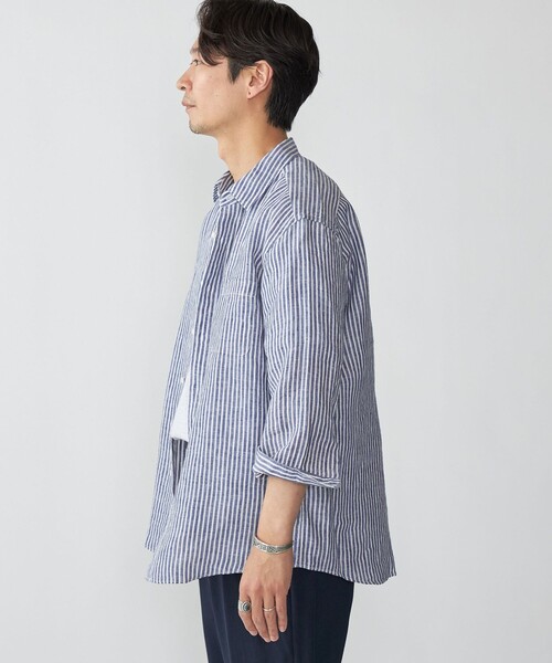 吸湿性と速乾性に優れた素材特性を活かし、春から夏にかけて活躍。袖をさりげなくロールアップして、デニムやスラックスとあわせれば、洗練されたリラックススタイルが完成します。こなれ感のあるストライプのリネンシャツがほしい方におすすめです。