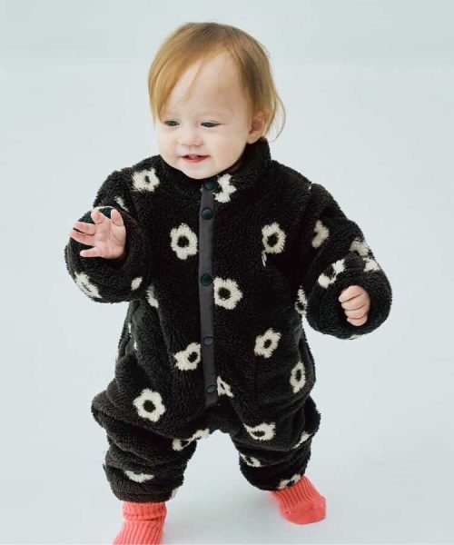 総柄やカラフルな配色が目を引く、個性的なジャンプスーツです。ふっくらとしたファーフリース素材を使用し、全身をしっかり防寒できるのが魅力。抱っこ紐やベビーカーでのお出かけにおすすめのベビーアウターです。