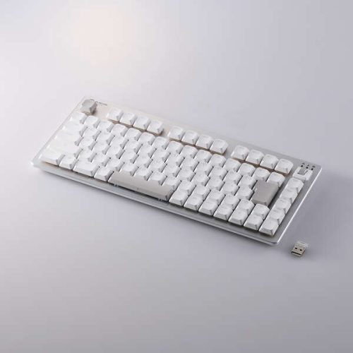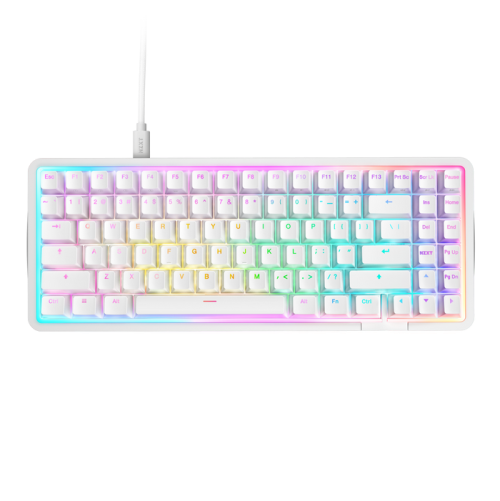磁気式アナログ検知スイッチを搭載した、75%サイズの白いゲーミングキーボードです。素早いキー入力を求める方におすすめのモデル。最短0.1mmの押し込みでオンできるため、一瞬の操作が勝敗を左右するシーンで反応しやすくなります。ファクトリールブが施されており、押し心地がスムーズなのも嬉しいポイントです。