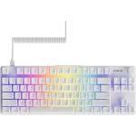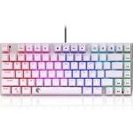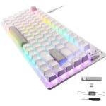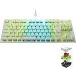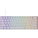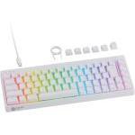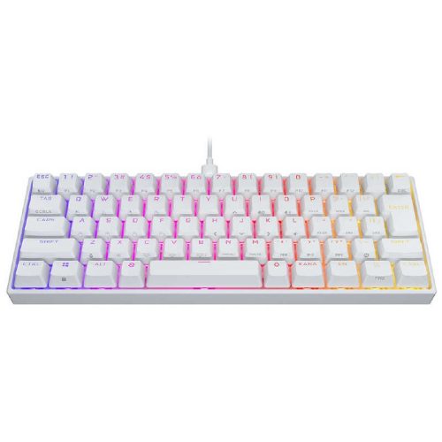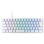 コンパクトな白いゲーミングキーボードです。英語配列の60%キーボードレイアウトを採用しており、デスクの上のスペースを占領しにくいのが特徴。薄型のメカニカルスイッチを搭載しています。