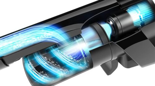 サイクロン式は吸い込んだゴミと空気を遠心力で分離し、ダストカップにゴミを溜める方式です。ゴミが溜まっても吸引力が持続しやすいのがポイント。効率のよいサイクロン構造と軽量高出力モーターにより、ハイパワーを実現しています。