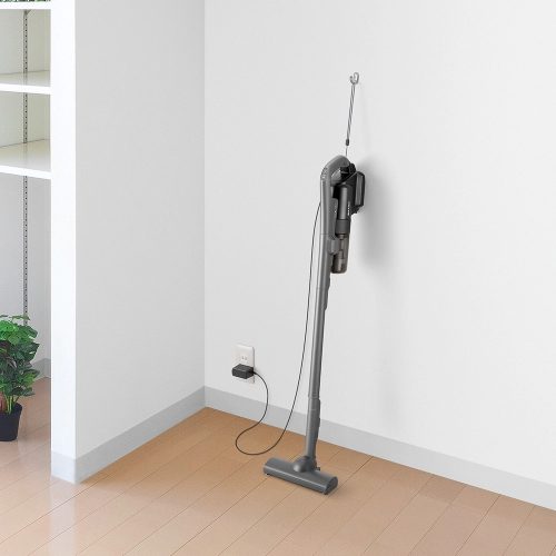 ゴミと空気を遠心分離するサイクロン方式を採用しており、吸引力が持続しやすい点も魅力。付属のストラップを使えば、フックに掛けてすっきりと収納できます。