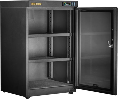 高性能ペルチェ式ドライユニットを搭載した40L容量の防湿庫。35~50%RHの範囲で湿度を可変設定でき、カメラやレンズを湿気やカビから守ります。電池不要のデジタル湿度計により、庫内環境を正確に管理可能です。