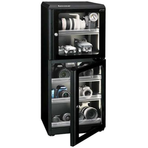 77リットルの容量でカメラボディ5台とレンズ9本程度の収納が可能です。3枚の引き出し棚により機材の出し入れがスムーズで、LEDバーライトが庫内の視認性を向上させます。扉を閉めると瞬時に湿度が下がる高い除湿性能も魅力。