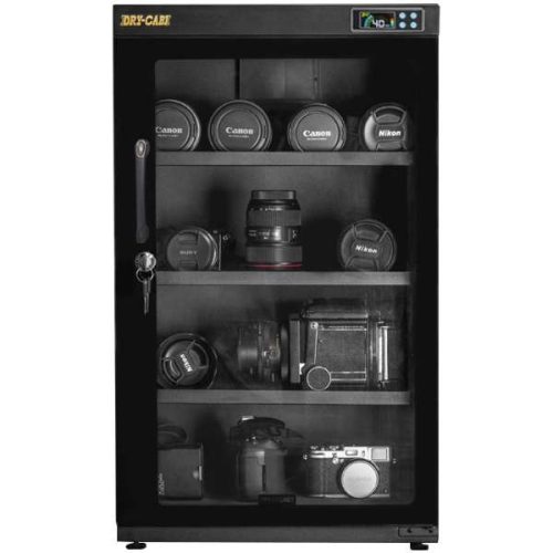 デジタル湿温度計を搭載した50リットル容量の防湿庫。カメラやレンズをカビやサビから守り、一眼レフカメラなら15~18台を収納できます。デジコンで希望の湿度に設定でき、ペルチェ式除湿装置により無音・無振動で動作。