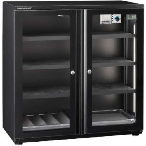 湿度を30~50%の範囲で自動調整できる電子式防湿庫。乾燥剤方式除湿ユニットにより、カメラや精密機器をカビや錆から効果的に守ります。107リットルの大容量設計で、一眼レフカメラ15~20台程度の収納が可能です。