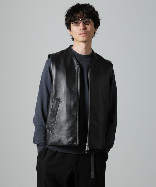 羽織るだけで着こなしをおしゃれに演出するレザーベスト。軽いうえに丈夫なラムナッパレザーを採用した、ジップ仕様のデザインです。アームホールにゆとりがあるため、厚手のニットやトレーナーともスムーズに重ね着できます。