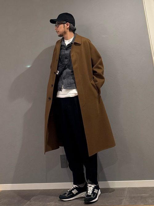 足元には黒のニューバランスを合わせ、程よくカジュアルダウンしているのが魅力。キャップや眼鏡といった小物を効果的に使い、こなれ感を演出しています。大人の余裕を感じさせる、バランスのよいコーディネートです。